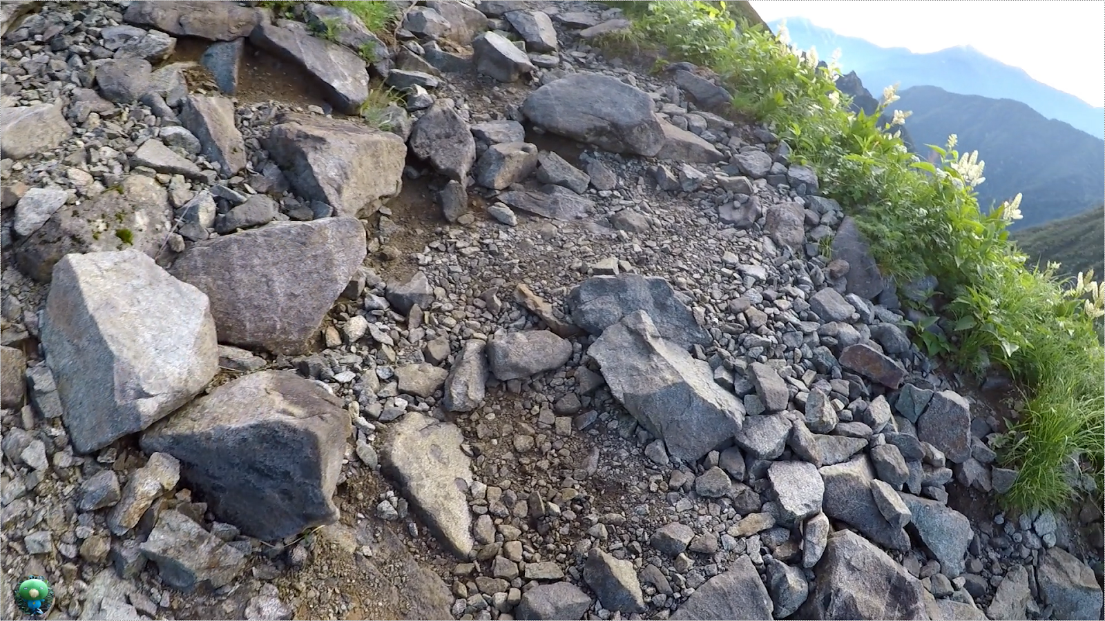 そんな緊張の連続した岩場もようやく抜け、ビル解体現場のようなゴロゴロの斜面を登る。